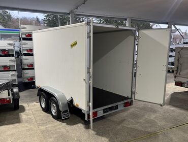 Die leichten Alu-Kofferanhängeranhänger sind serienmässig mit einer Ladeklappe und Heckstützen ausgerüstet.